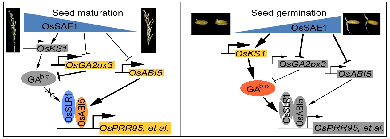 Recently, the research group of Dr. Hua Qin and Prof. Rongfeng Huang from Biotechnology Research Institute, Chinese Academy of Agricultural Sciences has revealed a novel mechanism of rice seed germination controlled by AP2/ERF transcription factor OsSAE1. The results are published on Journal of Integrative Plant Biology with the title of “OsSAE1 orchestrates the antagonistical regulation of gibberellin and abscisic acid signaling to control rice seed germination”.