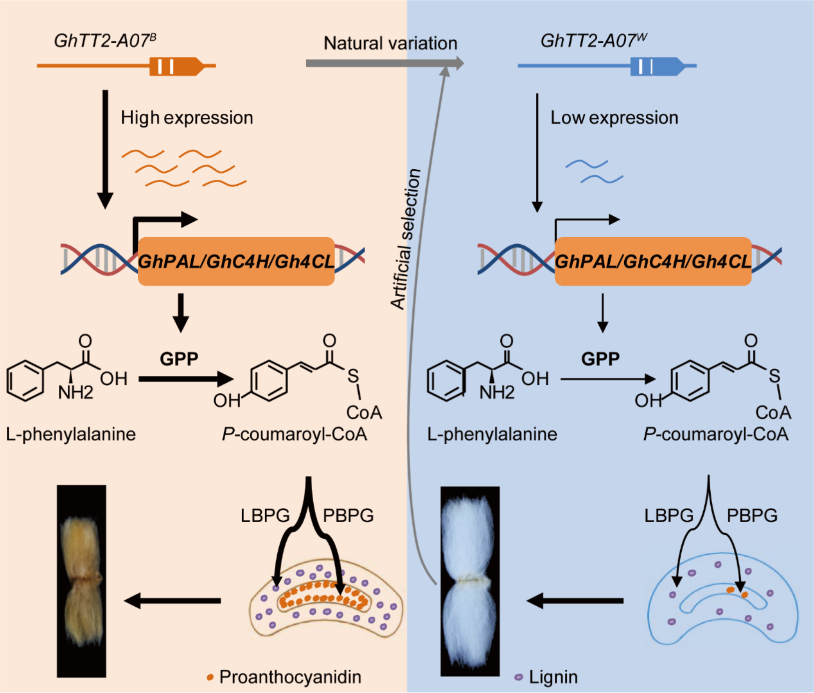 During the historical process of cotton breeding, natural variations in the GhTT2-A07 promoter region significantly down-regulated the gene’s expression during fiber development. This genetic change effectively reduced pigment biosynthesis while promoting fiber cell elongation and development. Haplotype analysis further confirmed that the low-expression haplotype of GhTT2-A07 underwent strong positive selection during cotton evolution and was ultimately fixed in modern high-quality white cotton germplasm. This study not only provides critical insights into the molecular regulation of cotton fiber development but also deepens understanding of the coordinated evolutionary trajectory of fiber color and quality during cotton domestication and breeding.