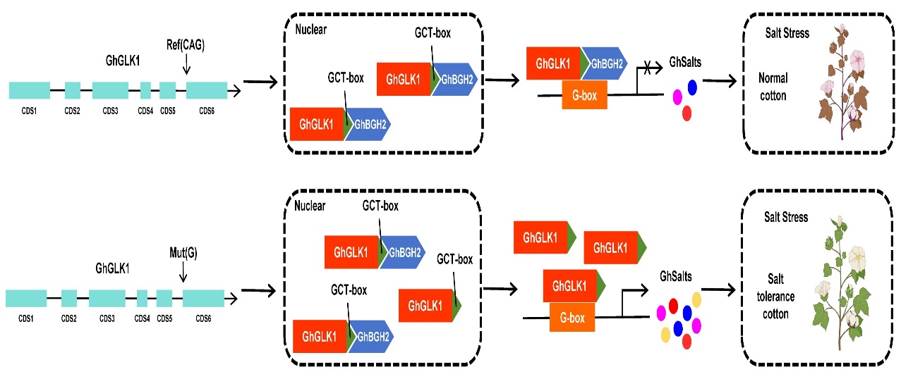 As a vital source of textile fiber, cotton faces significant threats from soil salinity, a major abiotic stressor that compromises both yield and quality. Research into cotton's salt tolerance mechanisms is therefore crucial for safeguarding agricultural production.The study demonstrated that under salt stress conditions, gene-edited mutant cotton lines with disrupted GhBGH2 function exhibited markedly enhanced salt tolerance. Further mechanistic investigation revealed that the GhBGH2 protein interacts directly with the activation domain of the transcription factor GhGLK1. This interaction suppresses GhGLK1's ability to activate the transcription of downstream salt-tolerance genes. However, when GhBGH2 is mutated, this repression is lifted, allowing GhGLK1 to freely activate its target genes and thereby strengthen the plant's salt tolerance.This discovery provides a fresh perspective on the molecular basis of salt tolerance in plants and offers both theoretical foundation and genetic resources for the genetic improvement of salt-tolerant cotton cultivars.