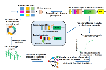 With the development of high throughout biology techniques and artificial intelligence, it becomes increasingly feasible to design and construct artificial biological parts, modules, circuits and even biological systems. To overcome the limitations of native promoters in controlling gene expression, artificial promoter design aims to synthesize short, inducible and conditionally controlled promoters to coordinate multiple genes’ expressions in diverse plant metabolic and signalling pathways. Synthetic promoters are capable of driving gene expression accurately with smart responses and have versatile usages, highlighting their potentials to enhance desirable