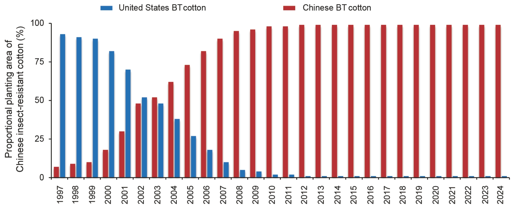 图3: 中美Bt棉花在中国种植面积对比图