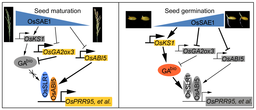 近日,中国农业科学院生物技术研究所作物耐逆性调控与改良团队联合内蒙古大学,揭示了乙烯响应因子(AP2/ERF)家族转录因子OsSAE1通过调控脱落酸和赤霉素之间的平衡来控制水稻种子萌发的新机制。相关研究成果发表在《植物学报(英文版)(Journal of Integrative Plant Biology)》上。