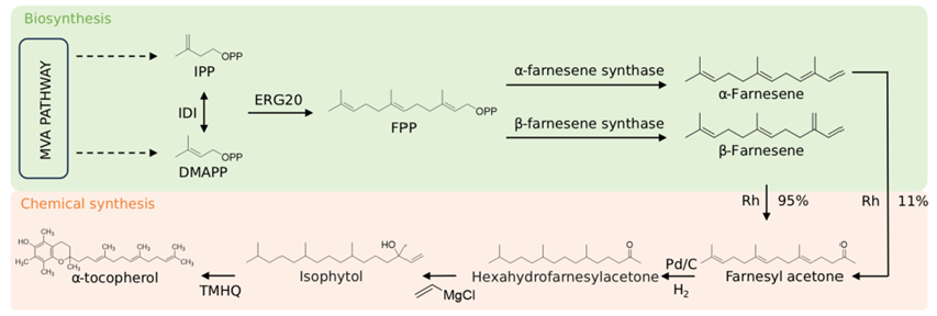 综述总结了近年来的重要突破:种子特异性酯酶VTE7的发现,揭示了叶绿素降解产物植醇直接回收用于生育酚合成的新途径,建立了叶绿素代谢与维生素E生物合成之间的直接桥梁。还总结了维生素E工业生产的发展进程:在维生素E的工业生产上,合成生物学正打破长期依赖化学合成的僵局,形成有效的生物合成网络,“生物-化学杂交策略”的开发与应用也显著简化了工艺并降低了碳排放,实现了全球供应的稳定与成本优化。