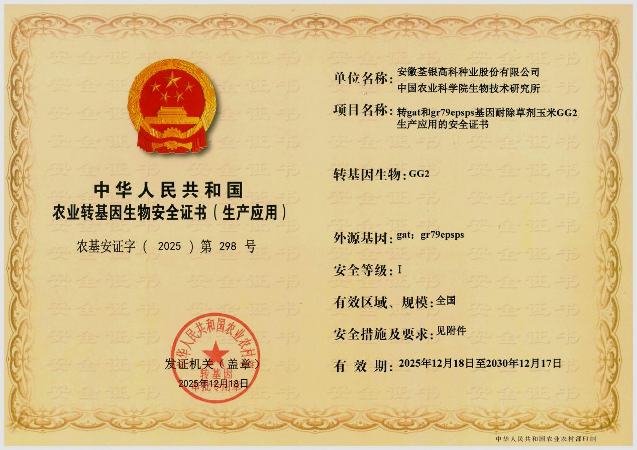 近日,由中国农业科学院生物技术研究所自主研发的转基因耐除草剂玉米转化体 GG2正式获得农业农村部颁发的农业转基因生物安全证书(生产应用),该成果为加快推进生物育种产业化、保障国家粮食安全注入科技动能。