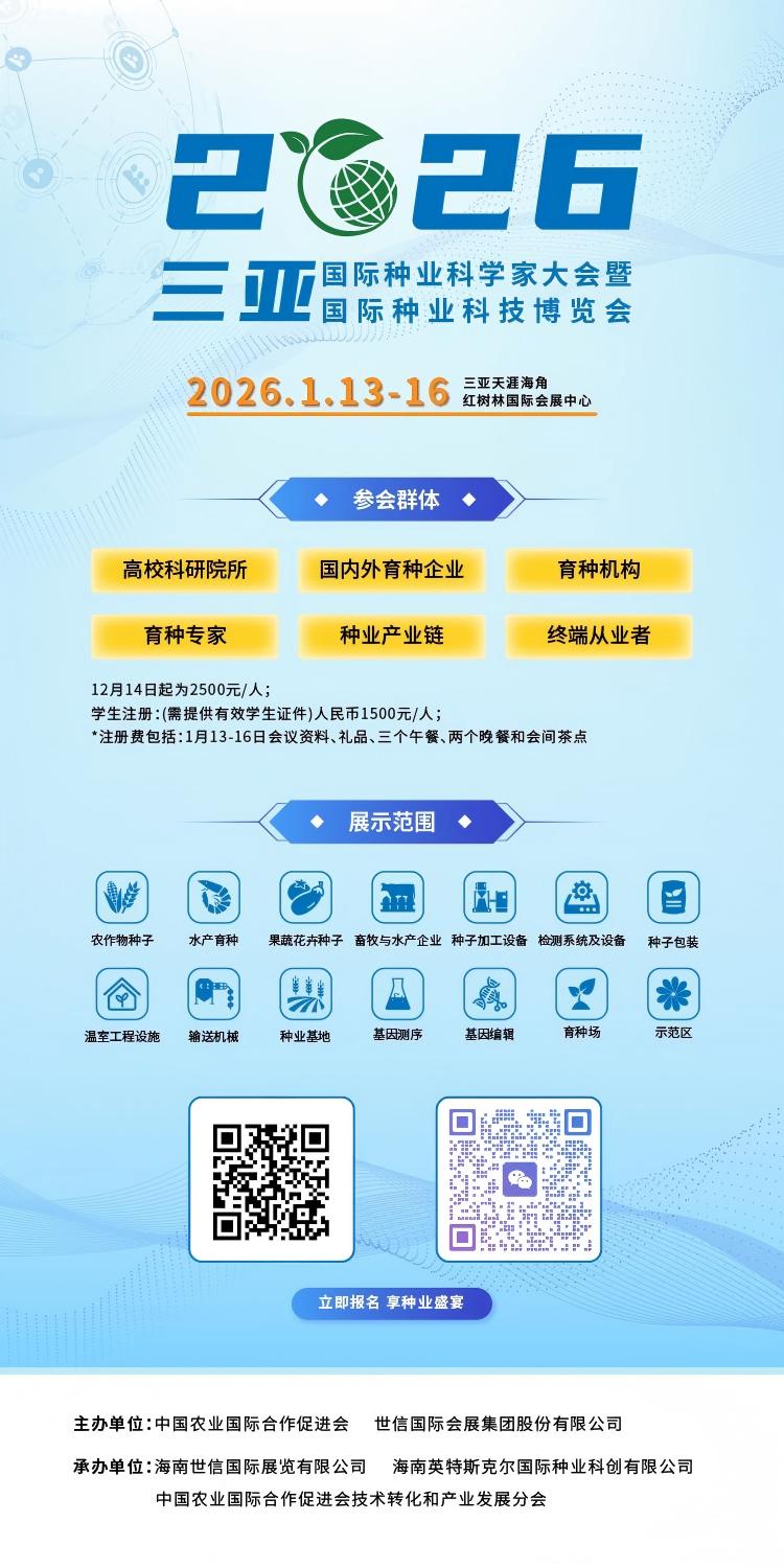 近年来,我国在全力推进种业振兴行动的过程中,把生物技术育种放在了战略核心位置,为农业从“追求数量增长”转向“注重质量提升、绿色高效、优质安全”的可持续健康发展,提供了稳固的技术支持和品种保障。为进一步促进我国生物技术育种的交流和学科发展,经研究,生物育种技术论坛将于2026年1月14日下午在三亚天涯海角红树林国际会展中心与2026三亚·国际种业科学家大会同期举办。现诚挚邀请各级政府领导、中外科学家、企业领袖、行业精英与来自近30个国家的种业科学家汇聚三亚,共商水产种业科技与产业发展大计。具体事项通知如下: